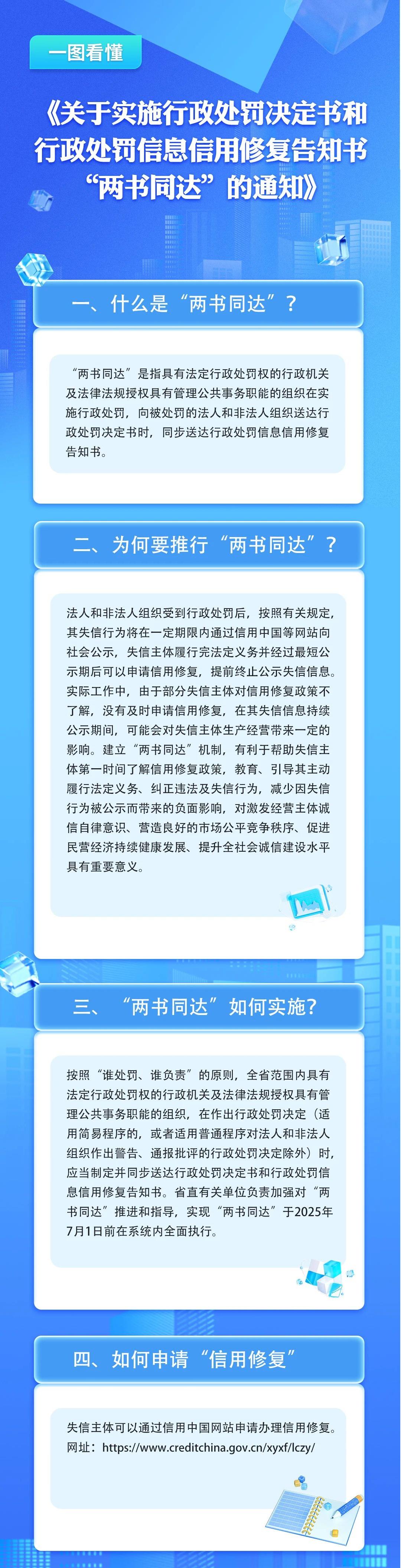 全面实施“两书同达”制度是贯彻严格规范公正文明执法理念、提升服务企业效能、构建以信用为基础的新型监管机制的重要抓手。下一步,省营商环境局将持续推动健全高效便捷信用修复机制,采取提示提醒、压缩办理时限、帮办代办等有力举措,加强督促指导,宣传指引,切实做到“两书同达”落地实施,进一步提升信用修复质效,保障广大经营主体合法权益,推进社会信用体系法治化、规范化建设,持续优化营商环境。